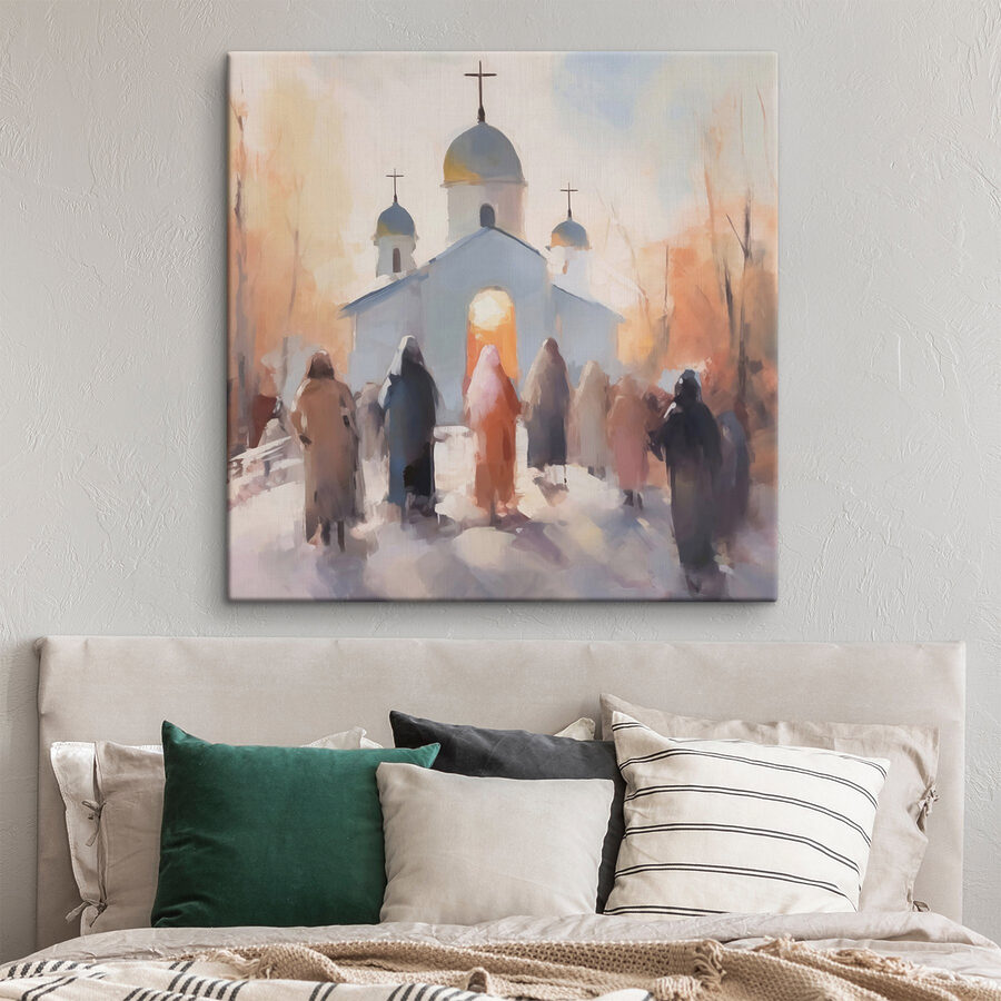 Stel je een rustige avond voor, een zachte gloed van een kerkdeur terwijl een diverse groep figuren ernaartoe wandelt. Deze canvasprint legt dat moment prachtig vast, met warme kleuren en zachte penseelstreken die uitnodigen tot reflectie en sereniteit. Het is perfect voor iedereen die zich verbonden voelt met het geloof of gewoon van een vredig tafereel houdt. Hang het op in een gezellig leeshoekje of een serene gang en zie hoe het de ruimte tot leven brengt. Het is niet zomaar een decor – het is een herinnering om te vertragen, adem te halen en misschien zelfs een beetje inspiratie te vinden in alledaagse momenten. Perfect om nostalgie op te wekken of een gesprek op gang te brengen, dit kunstwerk is een prachtig accent voor elk huis.