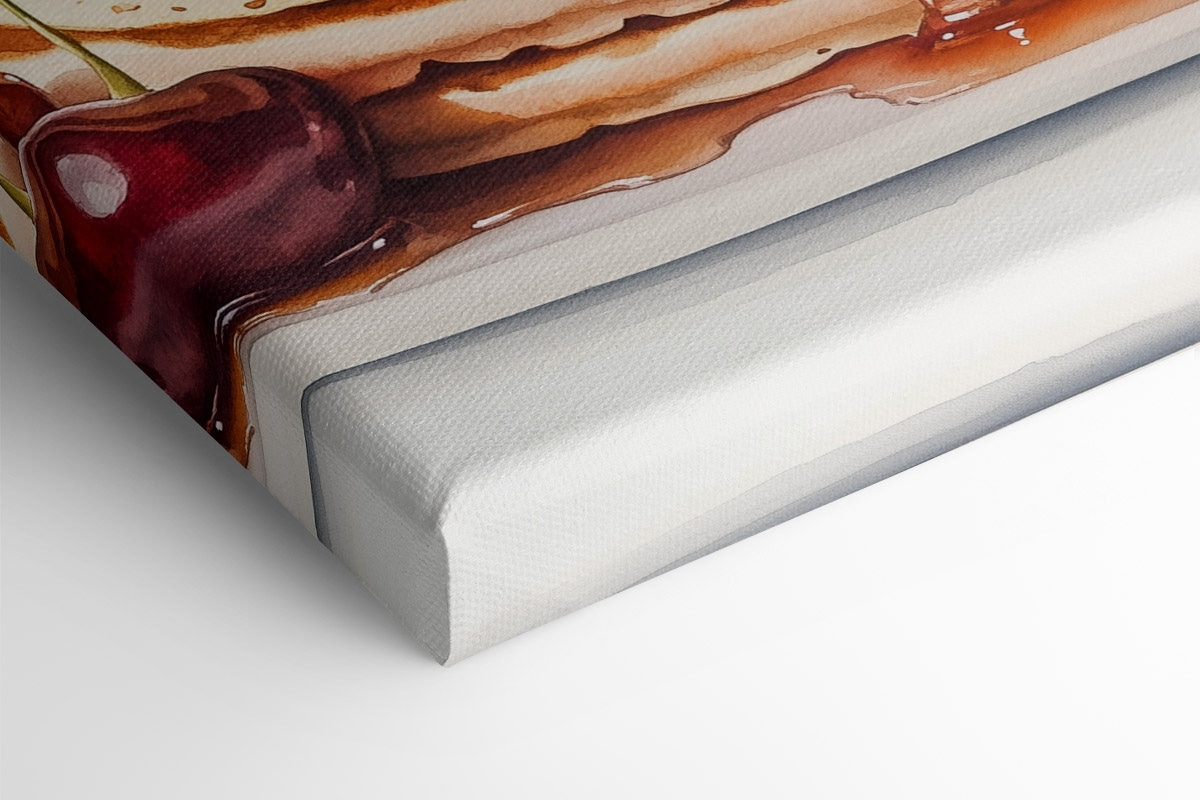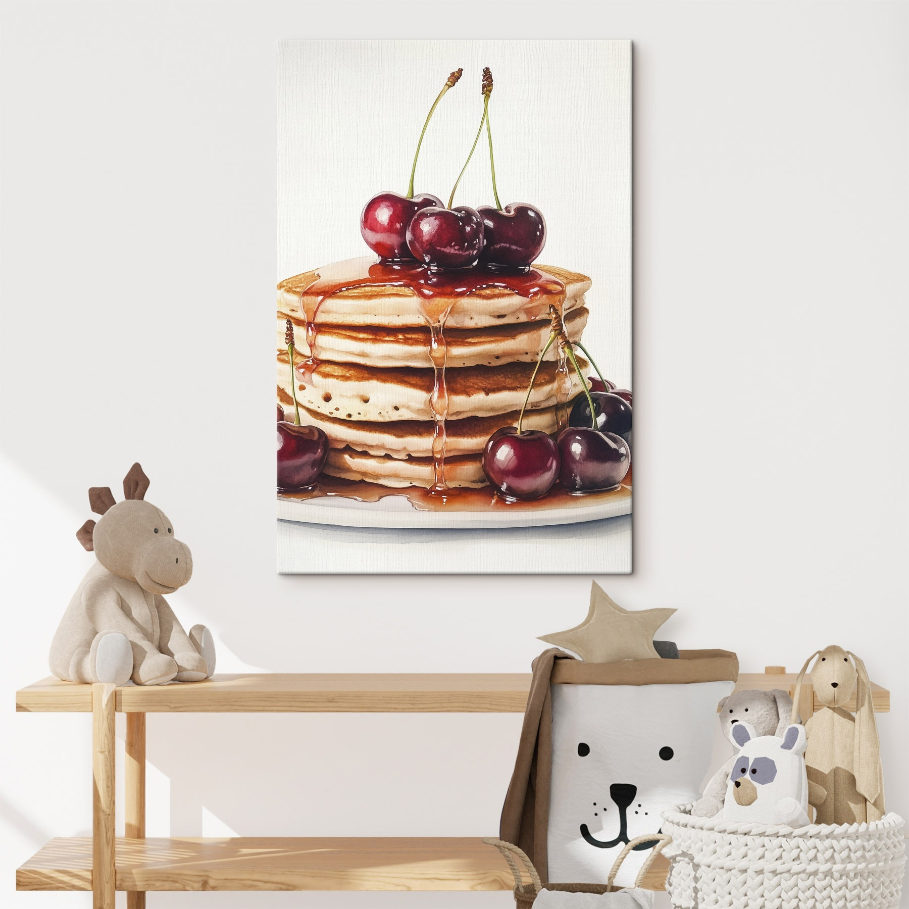 Duik in de heerlijke wereld van ontbijtgeluk met deze canvasprint met een stapel luchtige pannenkoeken, bekroond met sappige kersen. Stel je voor dat je dit in een gezellige keuken of eethoek hangt, waar het meteen gesprekken en misschien zelfs trek opwekt. Het is moeilijk om niet te glimlachen om die glinsterende kersen en druipende siroop – wie wil er niet aan beginnen? Dit levendige kunstwerk voegt een speels tintje toe, waardoor etenstijd speciaal aanvoelt. Perfect voor fijnproevers of iedereen die de ruimte wil opvrolijken met een vleugje zoete charme – het is alsof je het ontbijt uitnodigt om voor altijd te blijven!