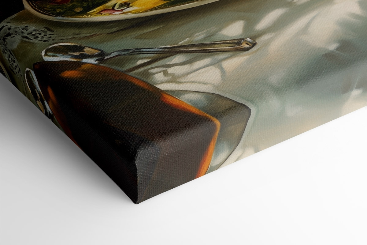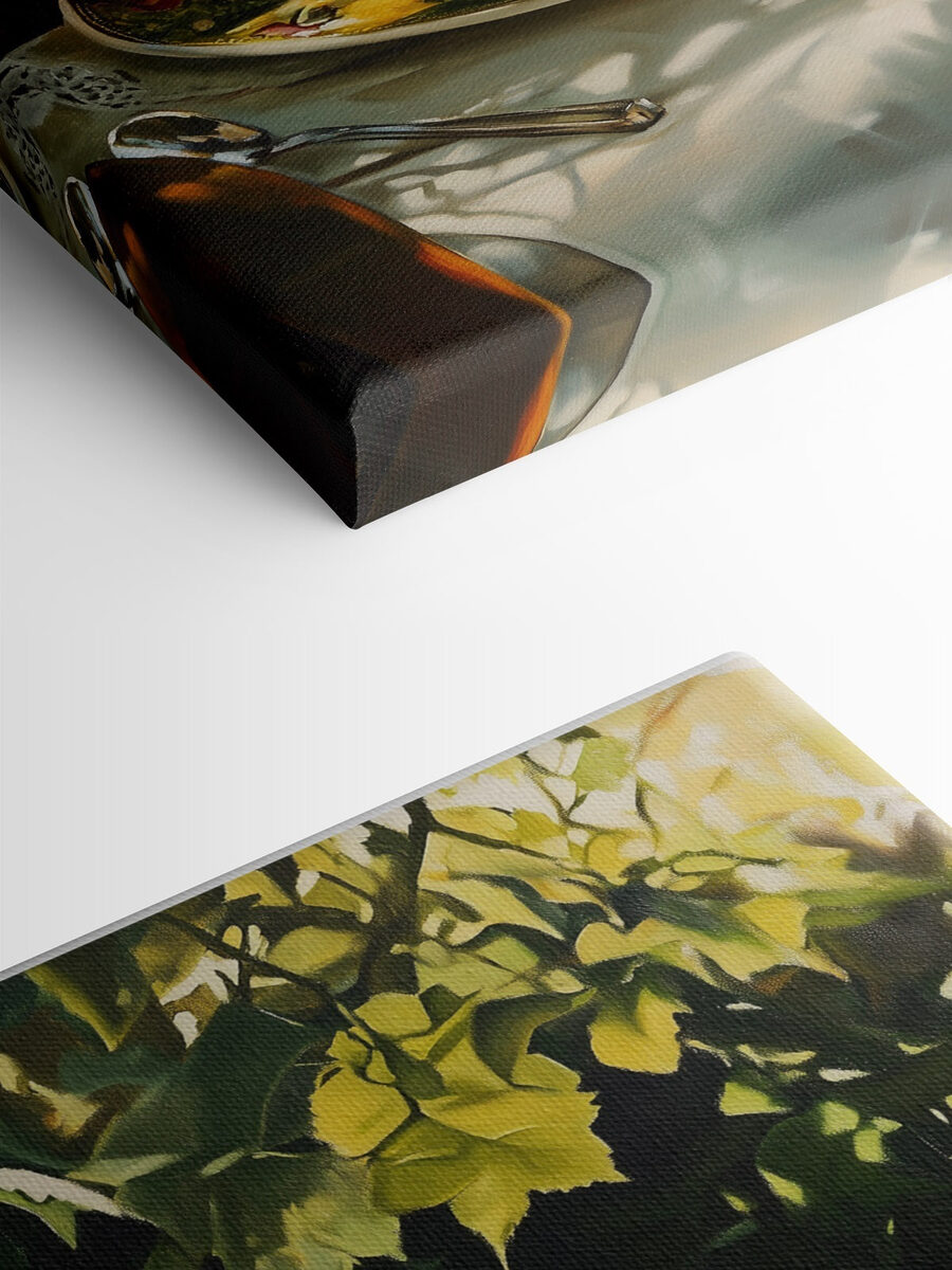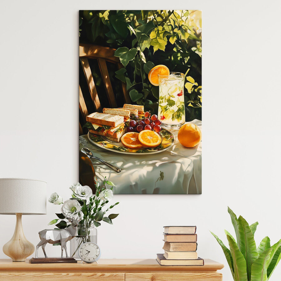 Stel je voor dat je keuken of eetkamer tot leven komt met levendige smaken, allemaal vastgelegd in een prachtige canvasprint met een heerlijk broodbeleg en sappig fruit. Dit kunstwerk roept gedachten op aan zonnige brunches, waar hapjes van verse sandwiches en schijfjes sinaasappel worden genoten met gelach en geweldig gezelschap. Het weelderige groen op de achtergrond doet denken aan zomerse dagen in de buitenlucht, misschien met een verfrissend drankje in de hand. Het is als een gezellige knuffel voor je muren – perfect om gesprekken op gang te brengen en elke maaltijd net iets specialer te maken. Dus waarom zou je je dag niet opvrolijken met deze uitbarsting van kleur?
