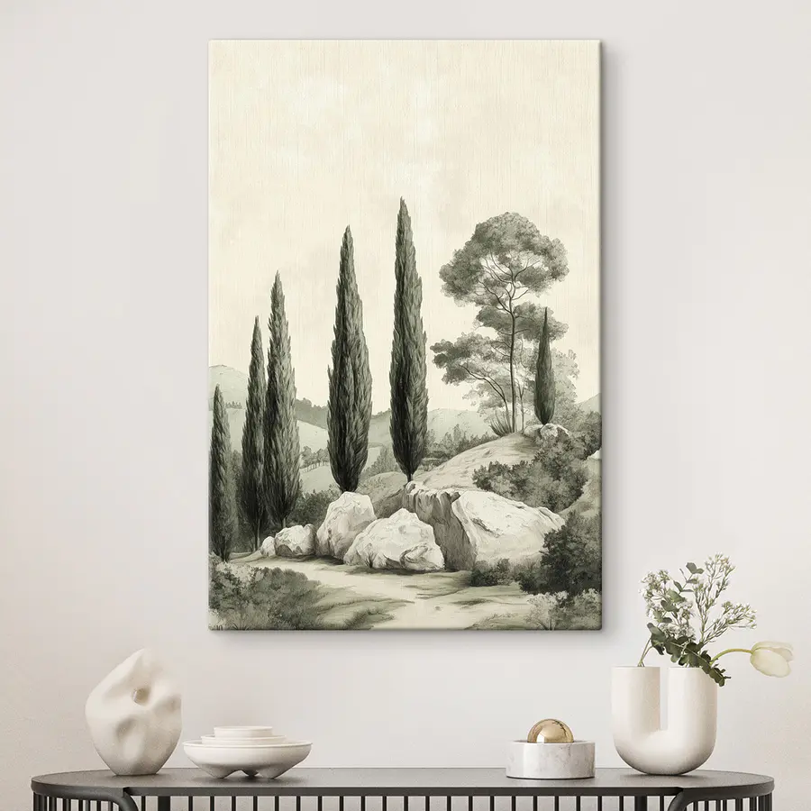 Haal een vleugje natuur in huis met deze prachtige canvasprint van een serene groep bomen op een glooiende heuvel. De zwarte en witte tinten creëren een klassieke sfeer en geven elke kamer een gevoel van rust. Stel je voor dat je ‘s ochtends aan je koffie nipt en naar deze hoge, elegante bomen staart die verhalen uit het verleden lijken te fluisteren. Het is alsof je een stukje buiten bij je hebt. Perfect voor mensen die van eenvoud houden en gesprekken willen aanzwengelen over de wonderen der natuur. Dit werk is een charmante herinnering dat schoonheid niet altijd om kleur draait – soms gaat het om de vormen die tot de verbeelding spreken.