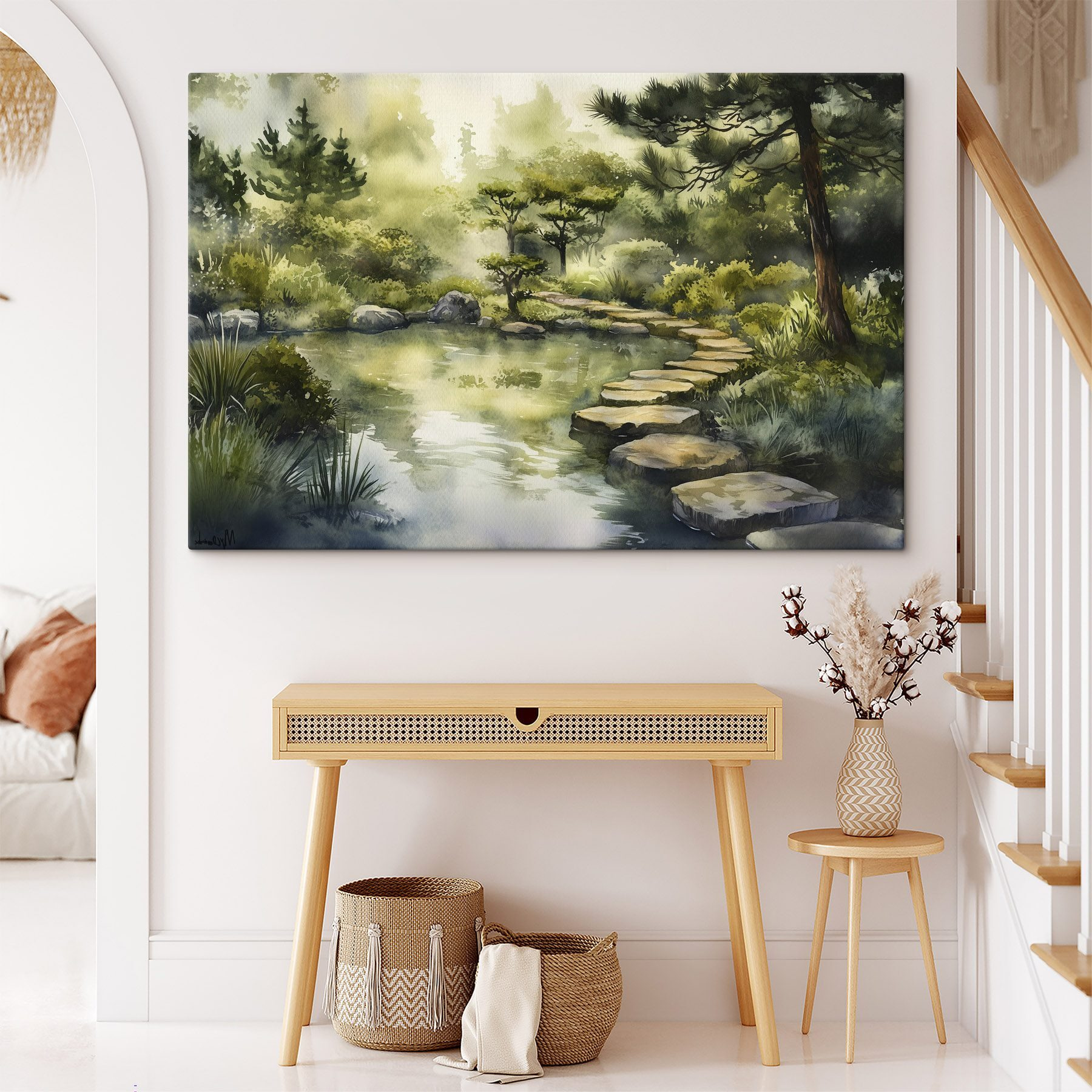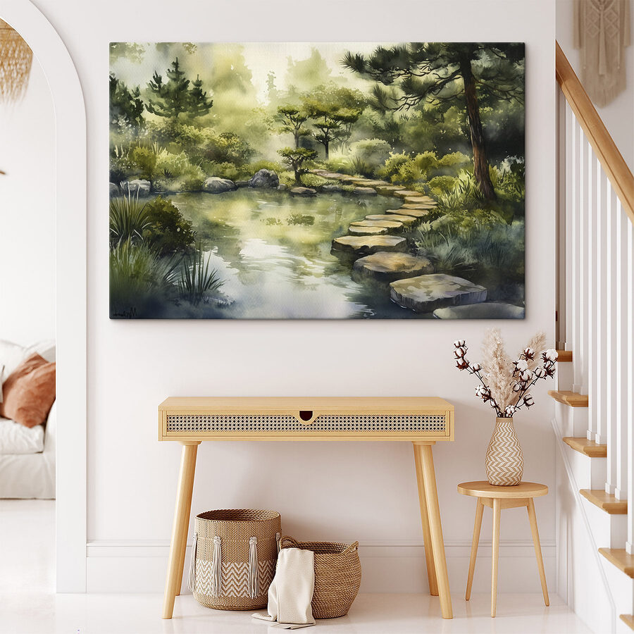 Transformeer je ruimte met dit betoverende aquarelschilderij van een sereen pad dat naar een rustige vijver leidt. Stel je voor dat je door een boslandschap glijdt telkens als je ernaar kijkt! Het zachte groen en het zachte blauw creëren een vredige sfeer, waardoor het perfect is voor een gezellige leeshoek of een levendige woonkamer. Stel je voor dat vrienden stoppen om het te bewonderen en zeggen dat het voelt alsof je een sprookjesboek binnenstapt. Elke penseelstreek nodigt uit tot dagdromen over vredige ontsnappingen en geeft je een gevoel van rust dat je omhult als een knusse deken. Omarm de schoonheid van de natuur binnenshuis!